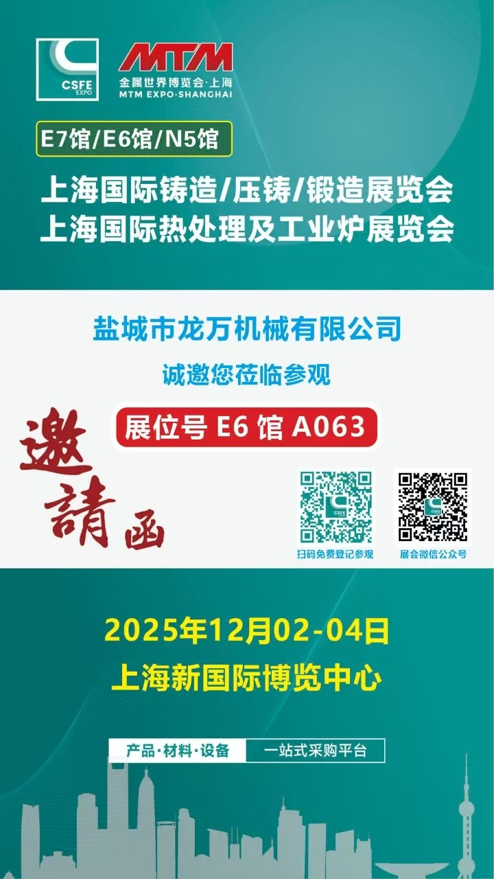 ستشارك شركة Yancheng Longwan Machinery Co., Ltd. في "معرض شنغهاي الدولي للصلب/السبك/المسبك" و"معرض شنغهاي الدولي للمعالجة الحرارية والأفران الصناعية" المنعقد في مركز شنغهاي الدولي للمعارض في الفترة من 2 إلى 4 ديسمبر 2025. يجذب هذا المعرض العديد من الشركات الرائدة في صناعات الصلب والصب والمعالجة الحرارية. ستستخدم شركة Yancheng Longwan Machinery Co., Ltd. هذه المنصة لعرض أحدث تقنياتها ومنتجاتها المبتكرة في مجال تصنيع الآلات.